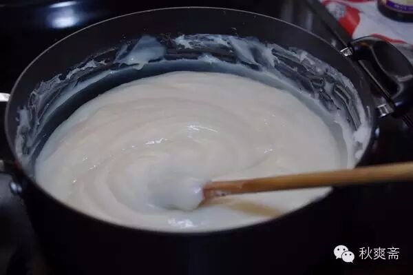 3,放锅中熬,不停搅拌;8分钟左右,开始成米糊状,但还是散的,这个时候搅动已经很困难了;调到中火,接着搅,大概再过4分钟左右,有粘的感觉了,这个时候比开始糊状的时候搅动起来要轻松一些了,感觉比开始“水”化了一些。用更科学的话说,就是一开始的糊,表面是漫反射,现在的糊,表面是镜面反射。总之,你一定会感觉到这个变化,这也意味着大功告成。