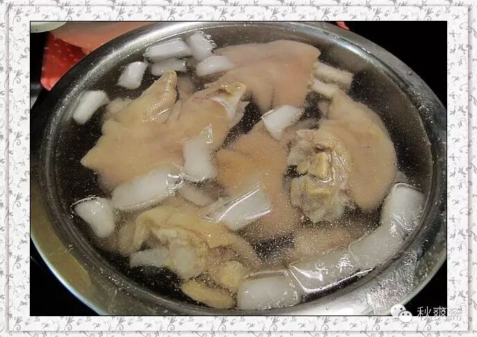【做法】第三步:拔凉水(加冰块)半小时~~~煮好的猪蹄捞出来,先冲一下凉水降温,再浸泡在冰水里(讲究的话可用凉开水:),这样处理之后软烂的猪蹄就爽脆了: