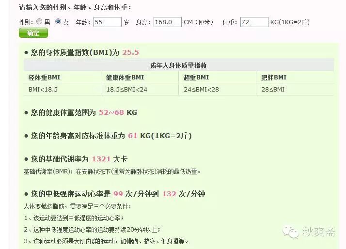 这些网站都有帮助你了解自己身体状况的小工具,只要把年龄,体重输入,就会得到诸如‘BMI’,‘基础代谢率’之类的数据。给大家看看俺在八月底(2012)的数据~~~妥妥地超标:)