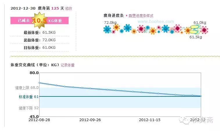 事实证明减肥期间完全放弃自己喜欢的美食是没有必要的,‘吃得聪明’的关键在于‘平衡’二字~~~只要每天吃进去的总热量不超过这个‘基础代谢率’,体重就会慢慢下降。再来看俺坚持记录125天之后的进展: