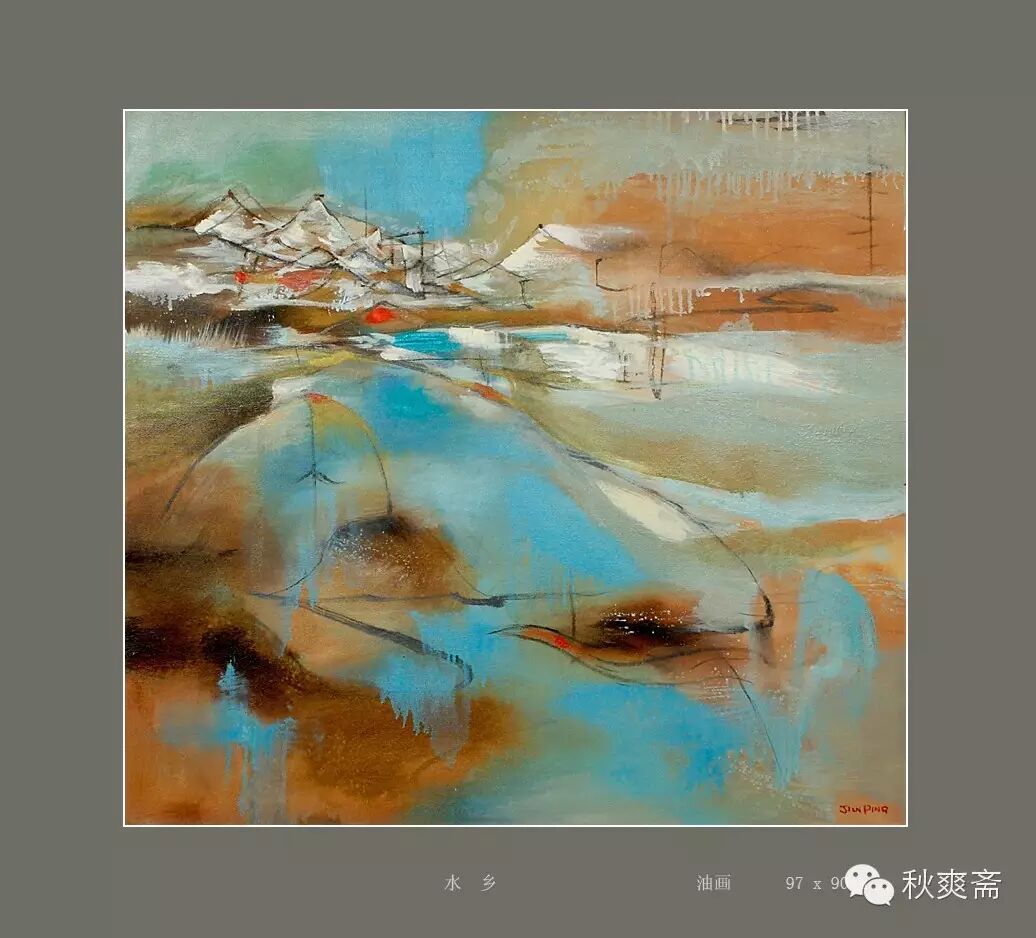这幅《水乡》油画很有些彩色水墨画的风格:有群青的凝重,石绿(