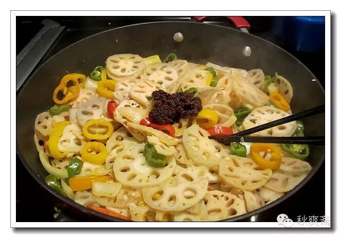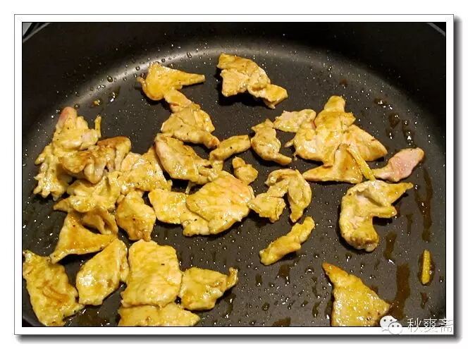 今天的晚饭又做了这个干锅藕~~~先用一小勺辣油煎肉片,变色就倒出: