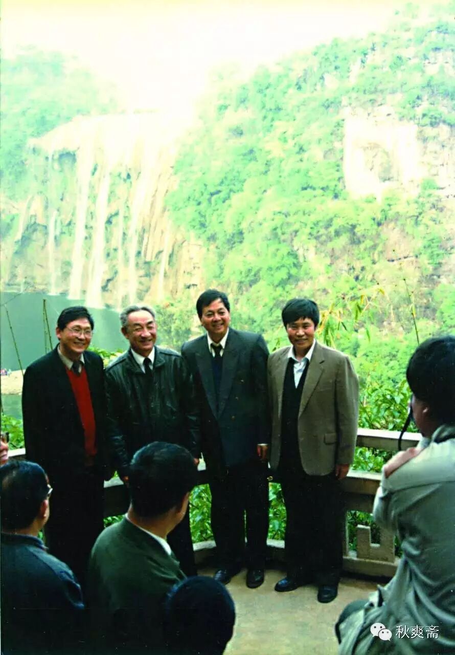 我们几个陪同他的负责人,不由得从内心佩服邹家华副总理的敏捷思维,也决心遵从他的指示,将黄果树的保护发展放在可持续的重点上来。这时北京的客人在大瀑布和邹副总理合影。来的两位女同志也和他合了影,省里的领导也和他合影。我们风景处的几个负责人也乘机和邹家华副总理,背靠大瀑布高兴的留了合影。事后我们还私下议论可惜雷选隆同志出差没能参加作陪留影,因为大家常开玩笑说过,他的长相和邹副总理很相似,如能参加留影,就能更好印证比较大家的私议了。
