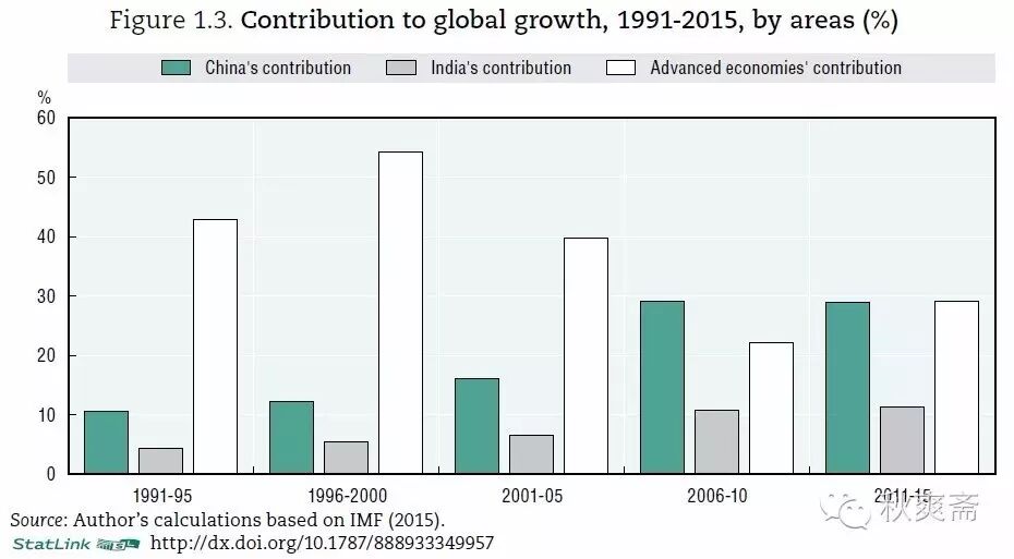 图中浅绿色的柱状图是历年中国经济对全球贡献的变化,白色是发达经济体(加总——看到图中的英文是复数了吧!),而灰色是印度的贡献。这些是根据国际货币基金的数据计算的,所以数据应该不会太不靠谱。