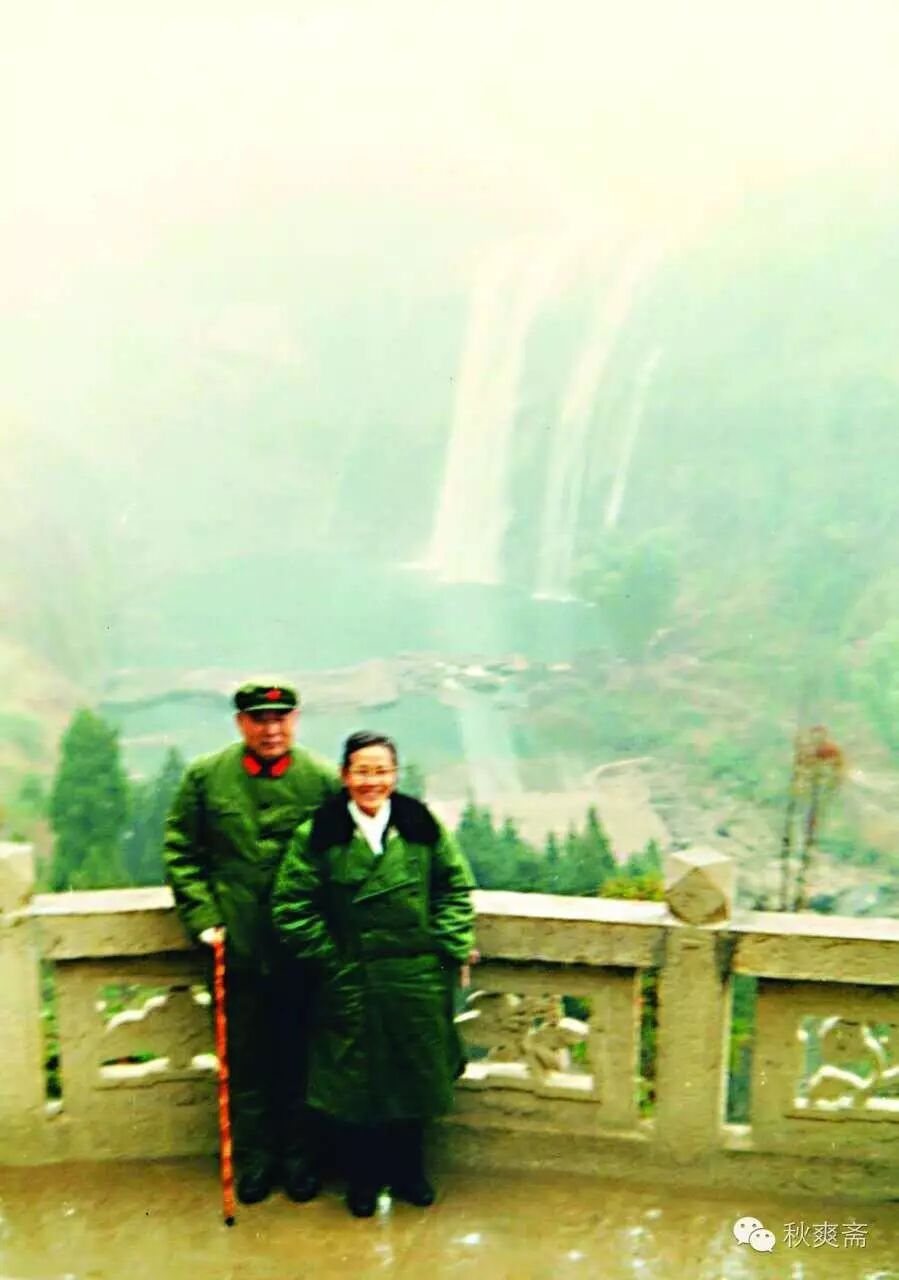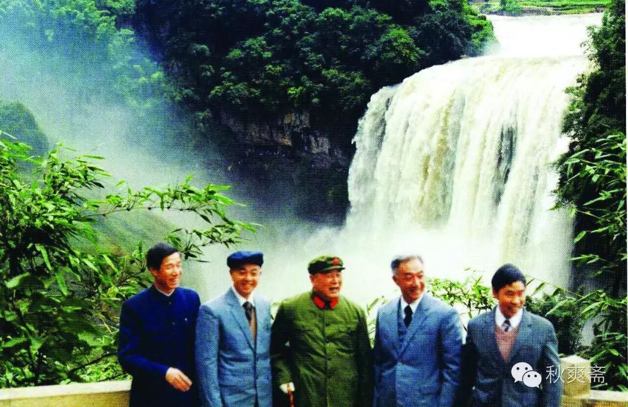 沿景区河边步行小道,到了大瀑布正面大平台,人们公认的最佳留影点,省、地的领导请李德生将军留影拍照,他高兴的站到背景为大瀑布位置和省军区的首长留影,旁边分别是两个秘书为他们打着伞,轮到夫人曹云莲和他留影时,他笑说“不用打伞了”,接着他和善的招手让我们黄果树的四个负责人和他照了一张个个欢笑的照片。