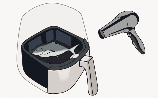 如果仍然有童鞋不理解,那么我们就不妨把空气炸锅加热食材的过程脑补成这样的过程——在密封的小空间内用一个高温电吹风连续吹200度的高速强力热风,通过热空气的冲撞,把热量直接传导给食物。