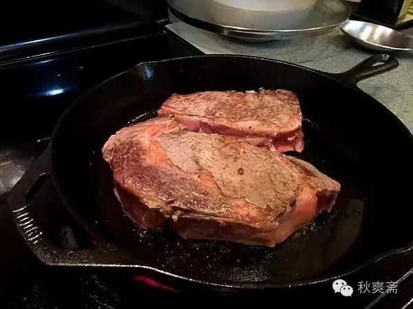 到时间翻面,煎另一面也是30秒:(目的是锁住内部的肉汁,等下烤的时候不会流失)
