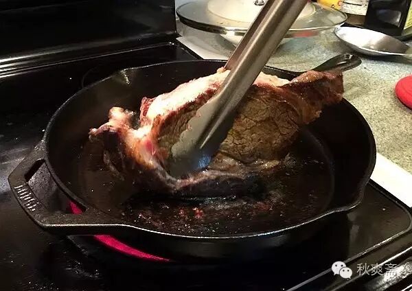 关掉烤箱,炉头再开高火,戴手套把铁锅从烤箱拿到炉子上。切一块黄油放到锅里,用夹子夹着把牛排四处周边都在黄油里煎一遍。或用勺子舀着黄油浇在顶面: