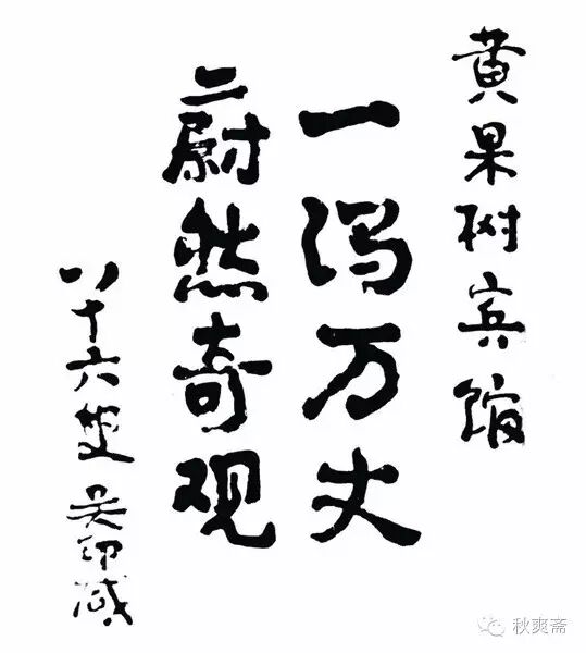 回到宾馆,老雷早已通知服务人员摆好桌子,铺好宣纸,放齐文房笔墨,请吴老题字留言。他细思片刻,站到台前,提笔为大瀑布写下了“一泻万丈,蔚然奇观”八个大字,落款是“八十六叟吴印咸”。