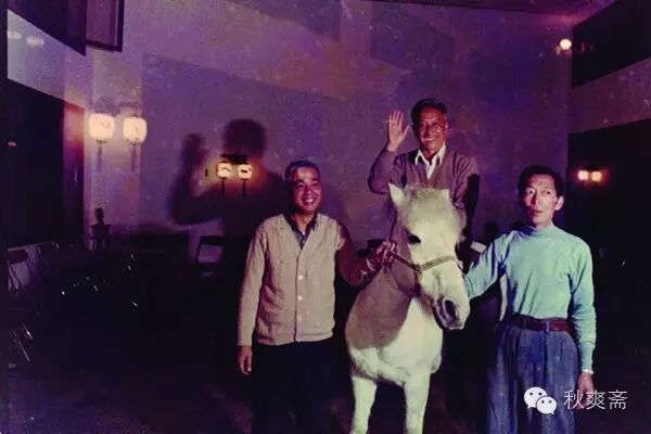 大家尽情欢庆痛饮,所有剧组成员,主要演员和我们一起在餐厅里留影纪念。老雷还骑着大白马,照了一张有趣的相。照片记录了我们当年和剧组欢乐的情景。仔细看照片,骑上白龙马的老雷,还在墙上留下了他的“佛光”呢,这个“佛光”的秘密我没有马上告诉老雷,我要留着作为给他的生日礼物。