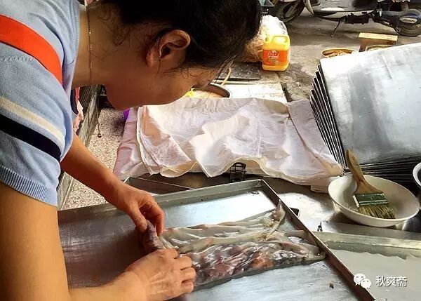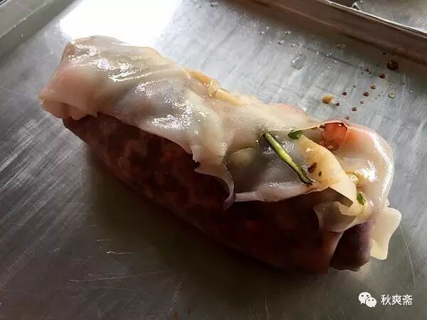 店员在做外卖的裹卷~~~把用整张的粉皮把客人选的各种调料卷起来: