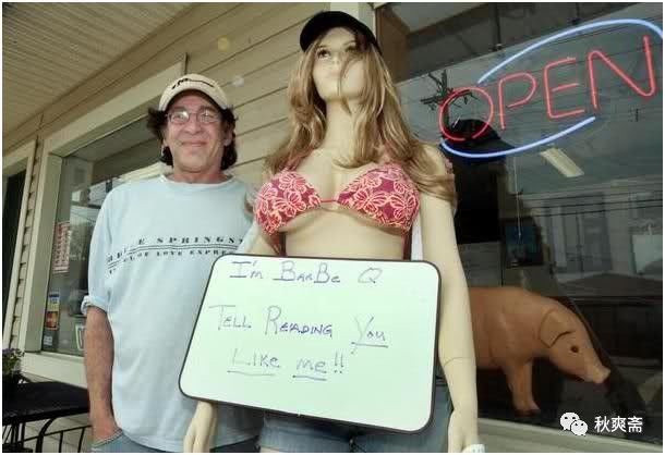 (Kenny Tessel,烧烤店老板,站在人体模特旁边。"烧烤"英文是barbecue,聪明老板给他的假美女起名为Barbe(美国女孩常用名),单姓为Q。这样,Barbe Q的读音就是barbecue,而当地小镇地名是Reading(这名儿起的,不会是当地文盲多需要加强读书学习吧?)。假美女胸前挂牌上说: 我是Barbe Q,请告诉Reading镇男女老少,你喜欢我 -- 美国佬的广告创意在此可见一斑。)
