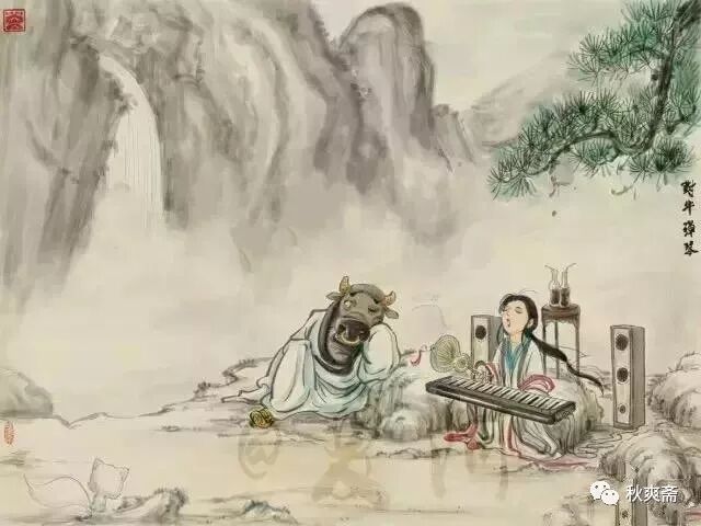 前两句把个‘对牛弹琴’的成语解得潇洒中含点无奈;后两句适用于很多有心事的人。