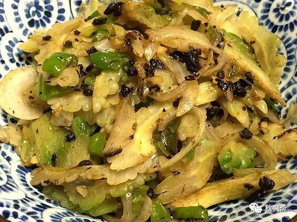 然后把豆豉炒香,下肉末炒散,喜欢的还可以加些辣椒。然后下煸过的苦瓜调味炒匀~~~干煸过就没那么苦了: