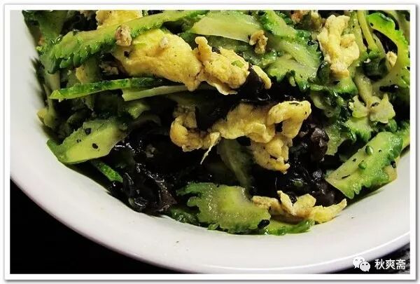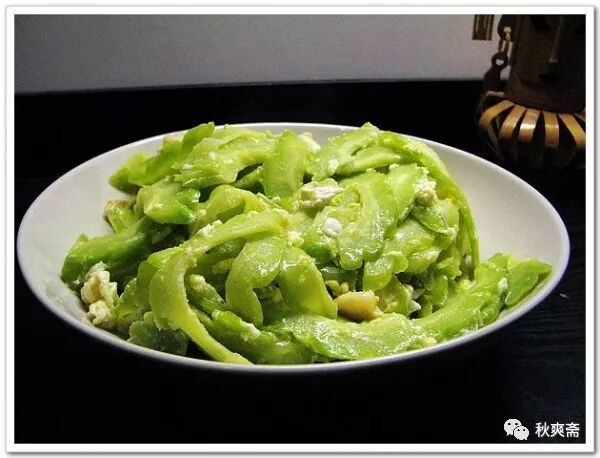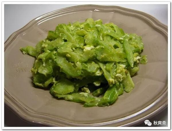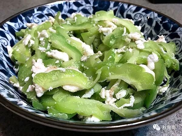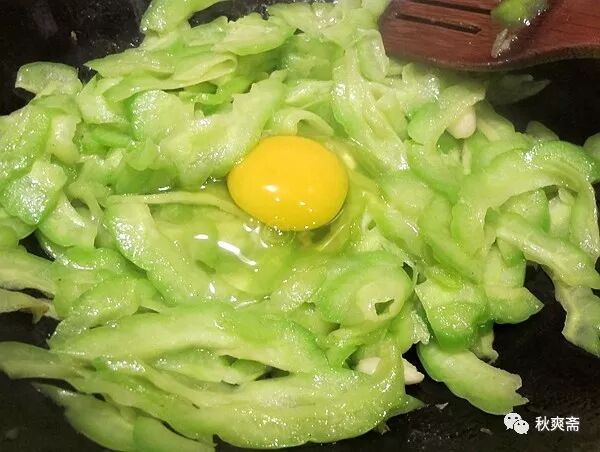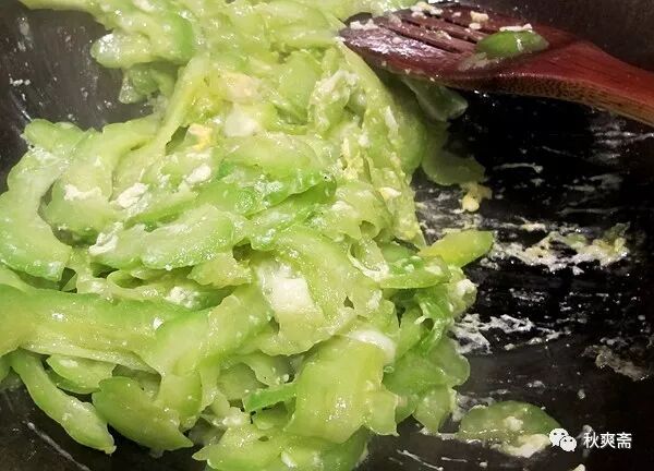起油锅呛点蒜瓣(可免),先放点盐,再下苦瓜片翻炒。然后加点糖(不用太多),炒软之后(最多两分钟)打一个鸡蛋入锅,接着翻炒几下,让蛋液包裹苦瓜,稍稍凝固就可以装盘了:
