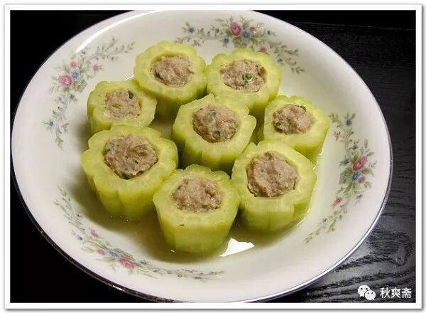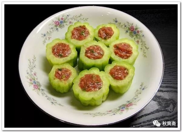 再来一个蒸的,也没啥技术难度~~~先把瓜切段,掏空;然后在开水里烫2-3分钟(水里先加一小勺油和盐);捞出来过一下冷水滤干。在内圈拍上点淀粉,塞上调好味道的肉馅(可以加点豆腐,虾等~~~自由发挥吧:):