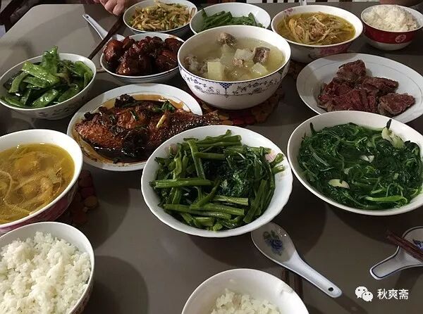 还是在家吃得温馨~~~88岁的爷爷炖的土鸡汤非常鲜美????姑姑烧的鱼和红烧肉都很好吃????我也炒了个扁豆茄子和空心菜:)