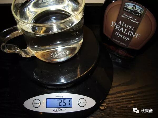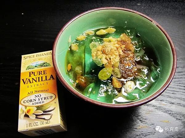 切开来,真跟水晶似的。这东西其实没啥味道,主要看配料。家乡的小摊上那配料那叫一个多,一个好吃。咱洋插队这个地方,就只能凑合啦~~~用的美国枫糖浆,再加一勺红砂糖,我不喜欢放水果,加了些切碎的果脯和花生碎。再滴几滴香精: