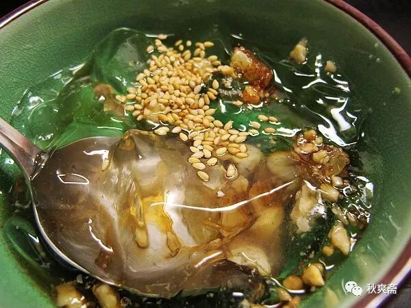 水晶凉粉应该是西南地区特有的小吃,小时候看过别人做~~~是用一种叫‘冰粉籽(查了一下叫假酸浆)’的植物种子,包在一块手工织的白粗布里,浸了水不停地揉搓,揉出一盆黏嗒嗒的汁液,然后加入适量的石灰水凝固。网上找来一张冰粉籽的图片,勤快的厨艺回国可上淘宝买点来试试~~~手工揉搓出来的口感味道都更佳哦!