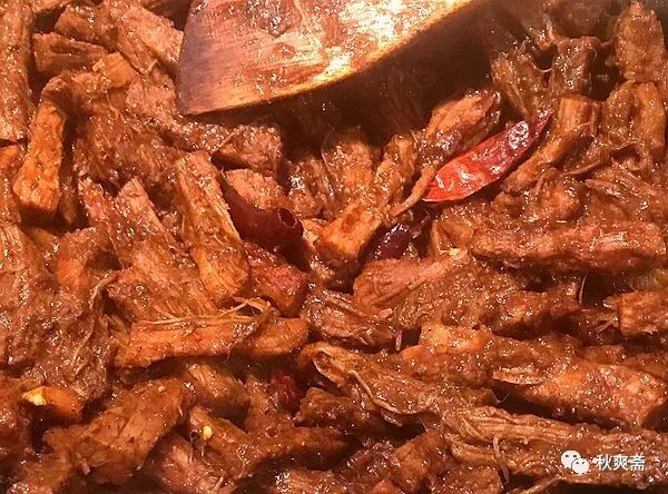 捞出肉片,等它凉下来,学李子柒顺着纹路撕成粗条:)