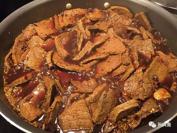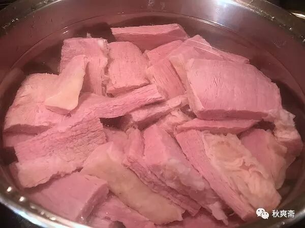 按常理,喝汤的肉冷水下锅;其它做法(红烧肉炖排骨之类)焯水的话,肉一般开水下锅(高温快速封住表面,减少内部鲜味的流失)。但是做牛肉干还需要保持形状整齐,冷水下锅收缩比较均匀,卖相好看得多。于是我用了炖骨头汤的方法,开火5分钟左右,就拿把勺子守在边上撇浮沫~~~调整火候,不要让汤滚开,再倒入几勺料酒去腥。浮沫撇干净,就可以捞出已经变紧致的牛肉片(不用煮太久),这锅牛肉清汤也很不错哦,过滤一下可以煮蔬菜或汤面:)
