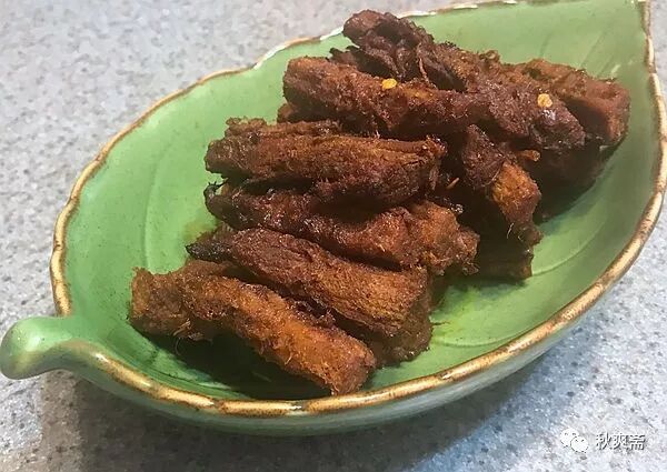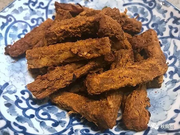几个月前看了李子柒的视频,也学她做了个偷工减料版的~~~工序比较复杂,又煮又炸又炒的。我用空气炸锅代替炸的步骤,撕得也太碎了一点,卖相欠佳,麻辣的味道还是不错的:)