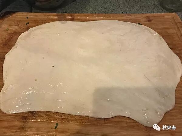 面团已经醒得很软了,抹了点油又在室温下放了半小时。菜板上也抹了油,根本不用擀面杖,用手四面拉一拉,抹一抹就成这样啦:)