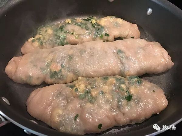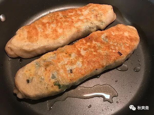 面皮太软,怕黏在蒸屉上改用煎的~~~不粘锅倒一点点油,中火稍微煎一下定型(一分钟左右):