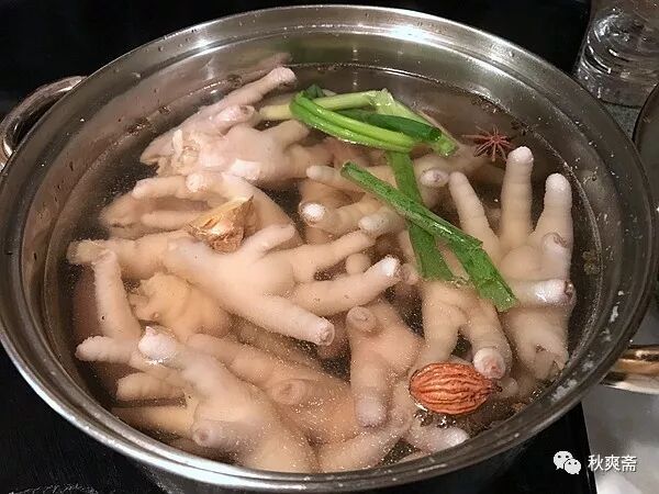 突然想到‘白砍蹄花’的做法,觉得可以参考~~~嗯,有了想法马上实践!沃尔玛的鸡爪新鲜干净又便宜,买回来先用加了两大勺白醋的清水泡一两个小时去腥: