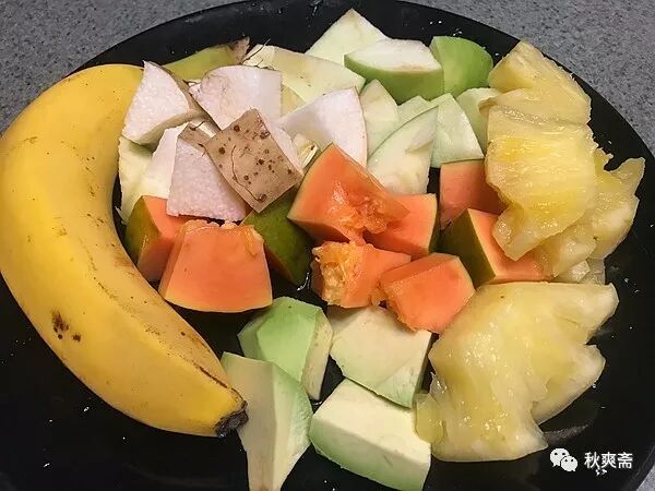 有了破壁机,就可以经常变换水果的种类啦~~~这是今天早上的搭配:香蕉,绿苹果,菠萝,木瓜;还有山药和半个牛油果: