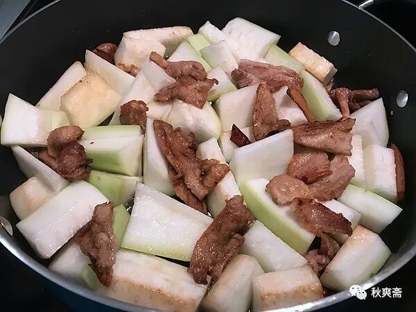 这个用的是肥廋相间的肉片,煎出油后下瓠子块: