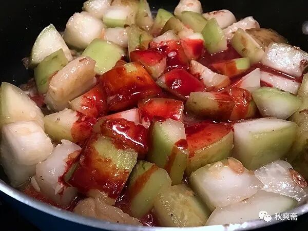 再换一种调味~~~买了一瓶南乳汁,瓜煎好后倒一点进去: