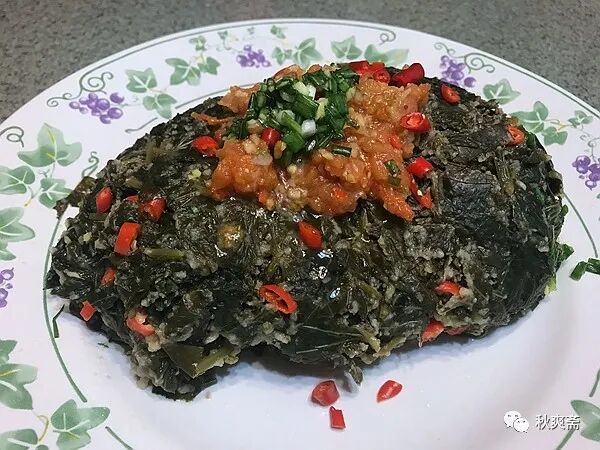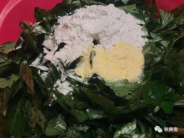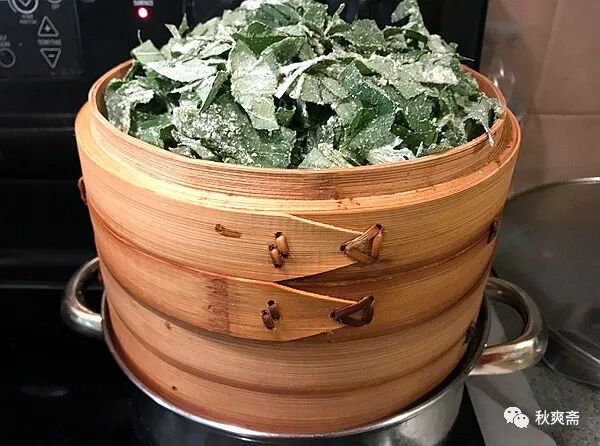 叶子洗干净,把水分抖干点切碎,倒一勺香油(或别的油)拌拌,再拌入少量面粉(我加了玉米粉),上笼蒸10分钟左右(根据量调整):