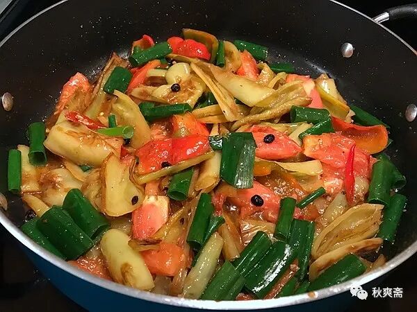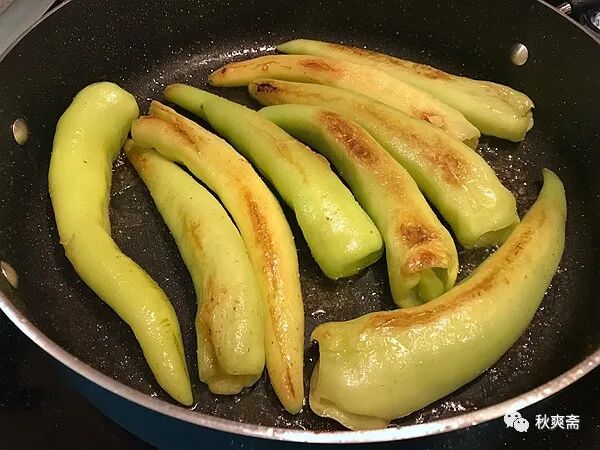 塞肉毕竟麻烦,偶尔做一次就够了。平时喜欢做虎皮椒~~~大的不沾锅很好用(也可以用空气炸锅,只是太小,要烤好几次,不如这个一次搞定),火不能大,可以盖上锅盖,会快一点: