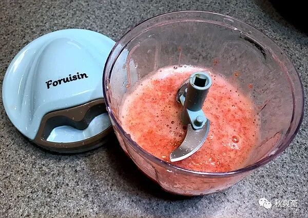 这个手动的小厨具很方便,西红柿去皮,随便切几刀,拉几下就碎了: