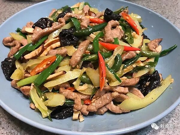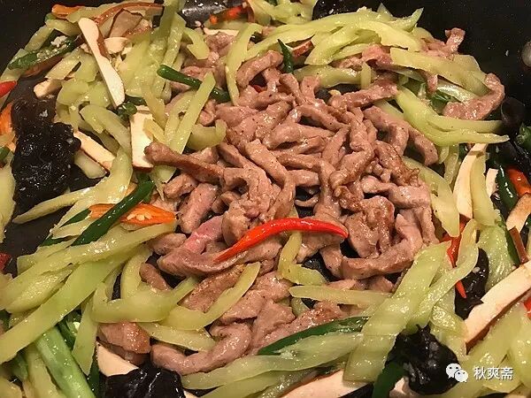 也可用来配菜~~~肉丝不要切太细,先用点料酒酱油胡椒粉淀粉拌匀腌十来分钟,下锅前再倒入一勺油拌匀。先炒配菜,然后把中间位置扒拉出来,摆上肉丝,先别翻动,等淀粉凝固了再用筷子划拉开(我的不粘锅,只用筷子或木铲):
