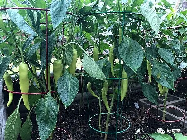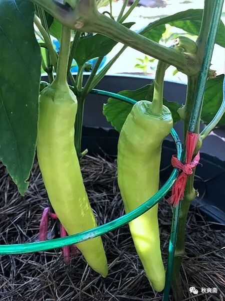 4月26号,最左边是朋友送的几棵苗,结的辣椒有点像四川人说的‘二荆条’,上次‘青红椒酱那篇(后面有链接)已经分享过了。有铁圈支撑的就是今天要分享的淡黄椒~~~沃尔玛买的苗,忘了看英文名字;右边几棵小苗是我用贵州带回来,平时炒菜呛锅用的辣椒籽育的苗,长出来却是朝天椒,以后再分享:)