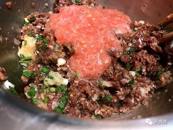 冻箱里囤了一大盒牛肉末,加了自己做的葱姜油,再来点新鲜西红柿汁: