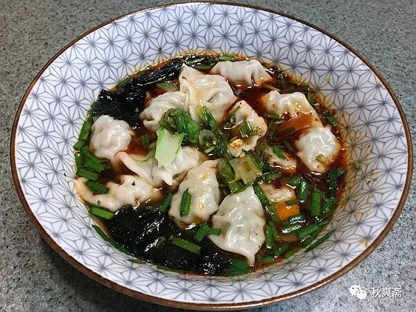 Costco买的小馄饨,懒得出去拔葱,撒了点韭菜叶子提味:)