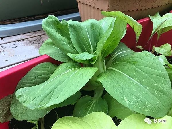 这两个红盆也是给我玩的~~~朋友给了一些菜种,白菜青菜菠菜混在一起,结果白菜比较多,右边角落里藏着一棵菠菜:)