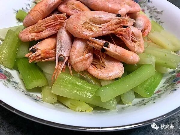 芹菜也烫烫,加点盐拌拌,去掉水分跟烫好的虾混合就好:)