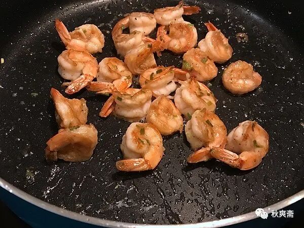 秋天是吃海鲜的最佳季节,大概是因为海鲜性凉,正好中和一下秋天的燥气?而韭菜跟海鲜其实还蛮搭,冻箱里有大虾仁,化冻洗干净弄干爽,加点盐胡椒粉淀粉腌制几分钟,我还加了一勺自己做的葱姜油。不粘锅,先摆好虾再开火: