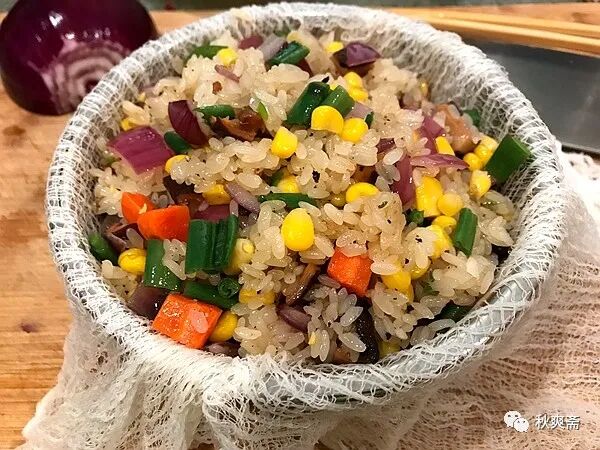 山菊从1996年开始烤火鸡,从来没有做过stuffing~~~除了怕麻烦,主要是老爷少爷都排斥糯米做的东西。今年正好要做酒酿就多泡了点糯米,留了一碗糯米饭。炒了些洋葱,冰冻玉米和四季豆,还有泡菜胡萝卜,跟糯米饭混合,只撒了点蒜盐调味:)