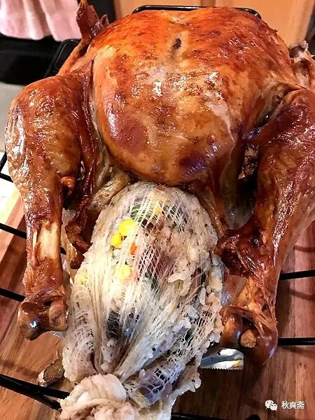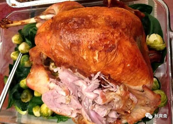 Emily:说忘了洗澡水里已经有蜂蜜,烤的时候又抹了点,结果多了点疤痕~~~不过她说不影响味道,火鸡肚子里的糯米饭尤其好吃:)