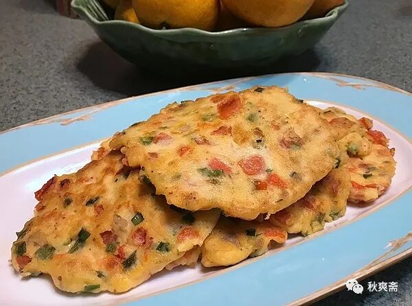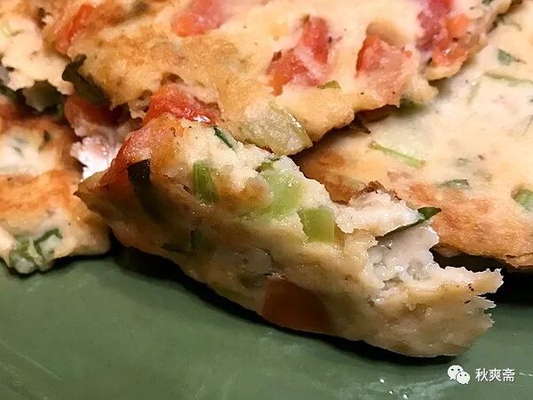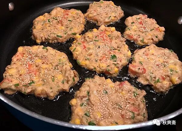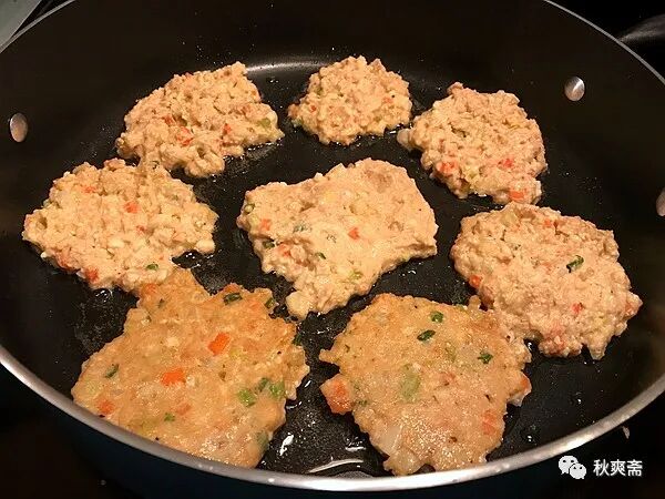 自己吃就不管形状了,不粘锅稍微多放些油(豆渣少油不好吃),用勺子舀一团进去,略微摁扁,小火慢煎~~~也可以煎定型后沿着锅边放一点点水,盖上盖子焖一会再翻面,两面都煎金黄就好了: