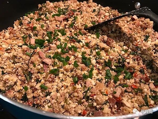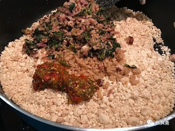 豆渣先用小火煸干水分~~~最好用不沾锅。这个就是花时间的地方,不能用大火,慢慢煸干压碎: