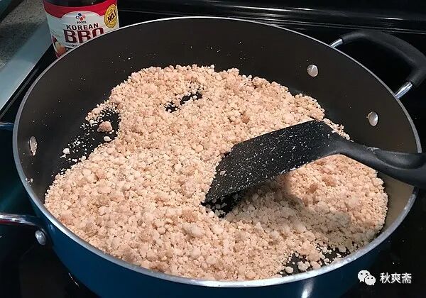 这个过程大概5-6分钟。然后我倒了几勺韩国烧烤酱进去一起煸,给豆渣码个底味~~~加酱油蚝油之类的也行,不加也可以~~~再倒几勺炒菜油(可以不加油,但是口感会比较干涩:)