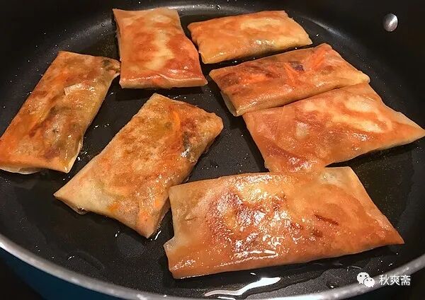 跟本地美食群主学习,把冻箱里的春卷皮翻出来,包上一些炒泡菜,煎一下又是一顿不一样的早餐:)