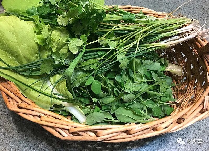 老爷摘了一篮子青菜白菜莴笋叶子,还有刚长出来的芥兰花:)