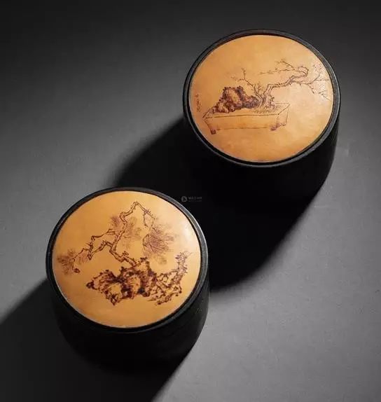 王世襄火绘葫芦片嵌镶红木圆盒成对及王世襄火绘葫芦别针